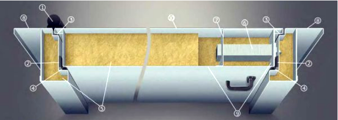 1) Каплевидная петля на опорном подшипнике, диаметр 22 мм. 2) Терморасширяющаяся противопожарная лента 15х1,5 мм. 3) Резиновый уплотнитель E. 4) Резиновый уплотнитель D. 5) Базальтовая каменная плита isovol 150-200 (противопожарная). 6) Противопожарный замок Door Lock. 7) Карман под замок. 8) Дверная коробка (цельногнутая стальная). 9) Дверное полотно (цельногнутое стальное). 10) Лист металла 1,4 мм холоднокатанный (порошковый окрас)